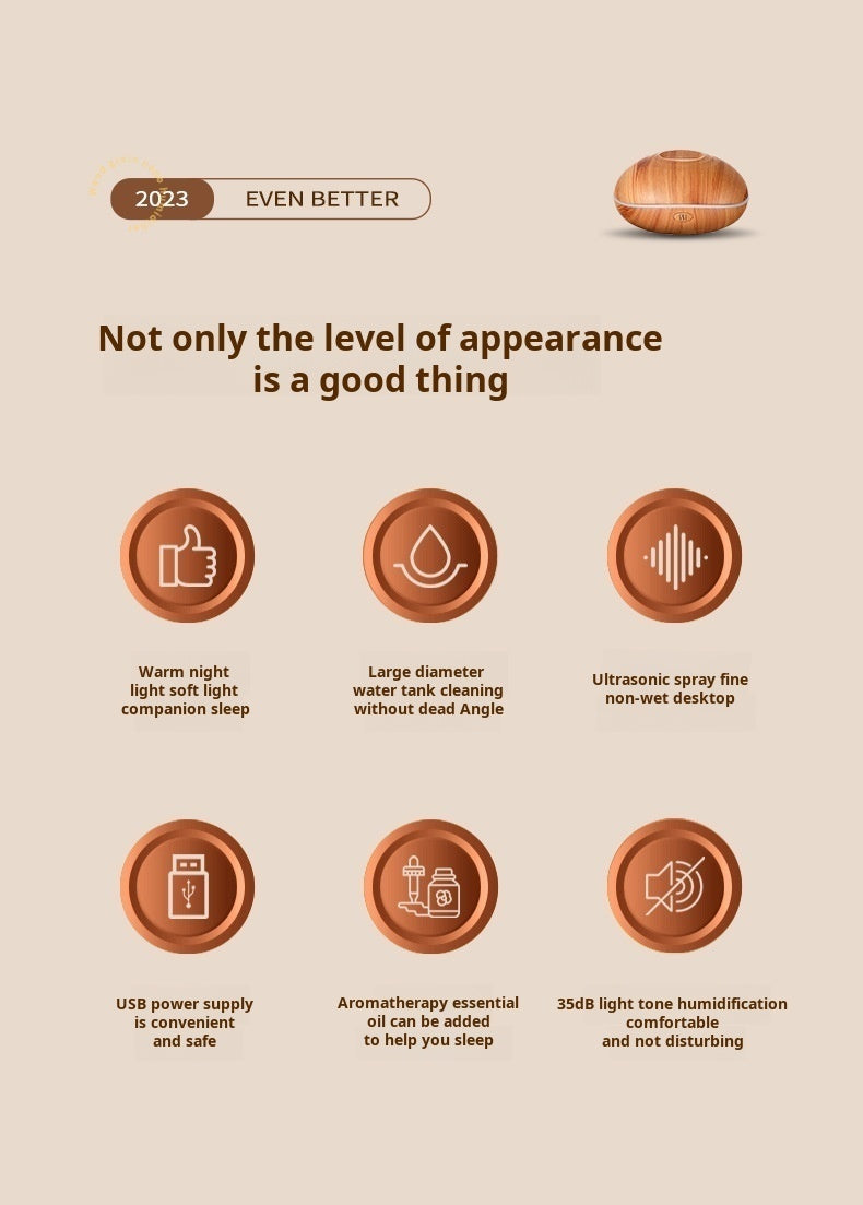 The Flame-Effect Wood Grain Aromatherapy Diffuser is a beautiful and functional addition to any small space. It enhances your environment with moisture, fragrance, and a flame-like glow that’s both soothing and visually appealing. Whether you're winding down at night, focusing in your home office, or setting a spa-like mood, this diffuser provides the perfect blend of wellness and style. Ideal for anyone who values atmosphere, tranquility, and clean air.