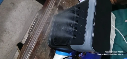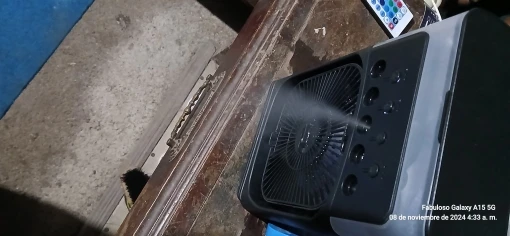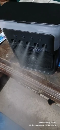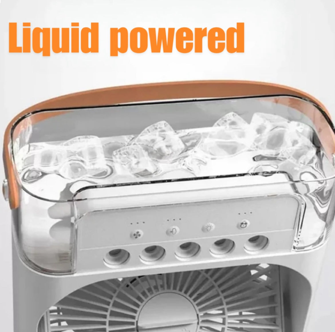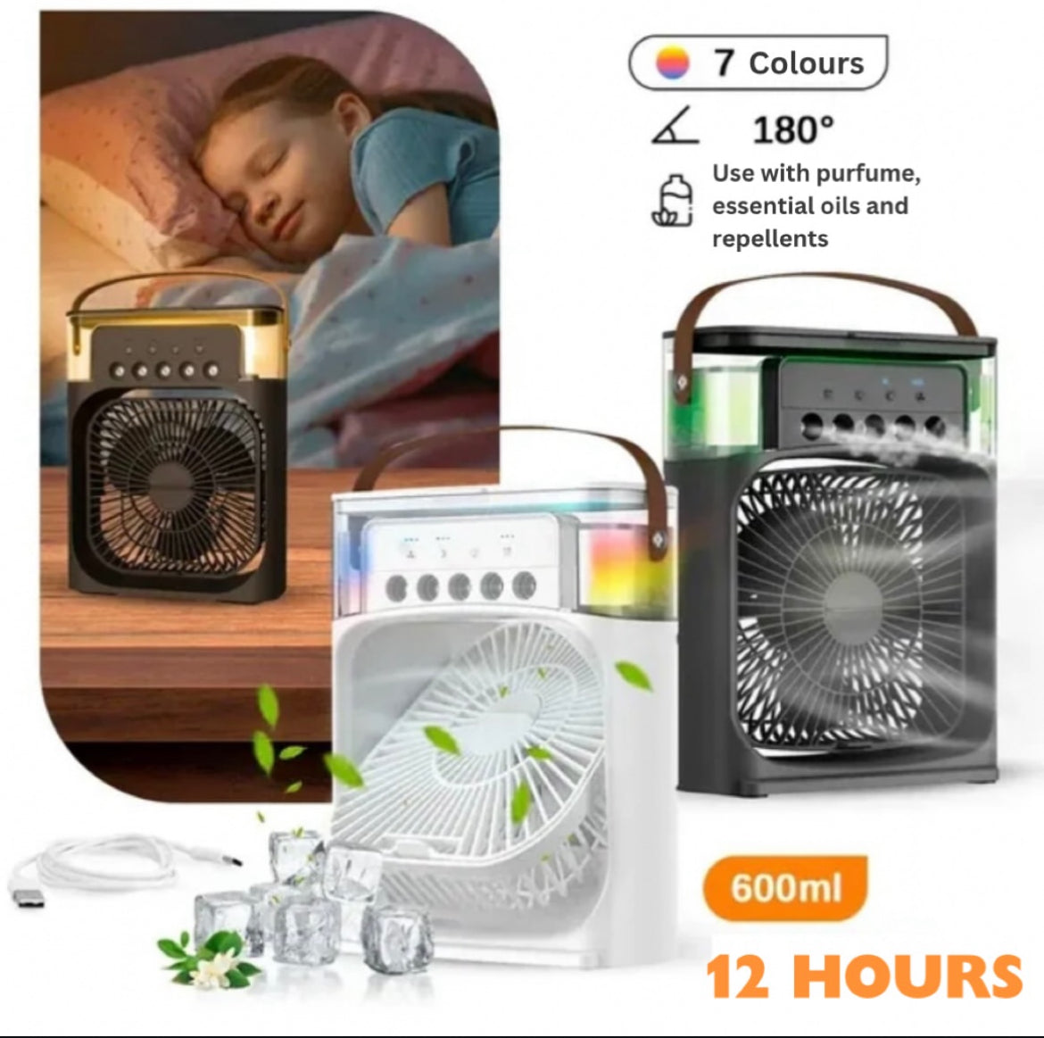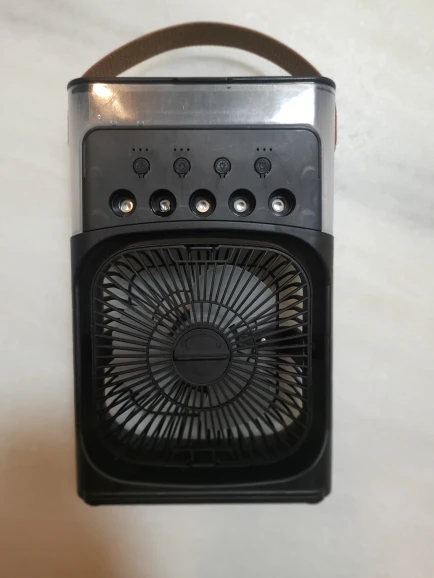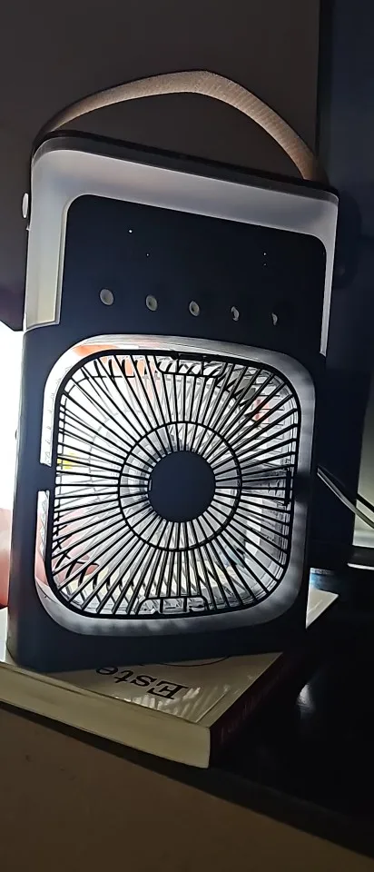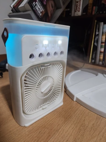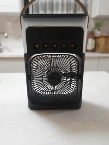 Mini fan, air conditioner and air humidifier with 5 sprays, it is portable with 3 air speeds and LED light with 7 colors. Product Description There are three speeds: Reduces the temperature and refreshes the air through water evaporation. Timing function: 3 types of automatic timing (1H/2H/3H), you can choose the most suitable one to enjoy your leisure, sleep or work time. Leather handle design: makes the evaporative air cooler easy to carry wherever you want. Up and Down Adjustable: Manually adjust the blowing direction up and down to 60 degrees to create your own personal cooling zone. Removable water tank design: It can help you clean the water tank better, and you can add ice cubes. 7-color LED lights The private air conditioner can display 7-color LED lights, you can choose your favorite color at will, and there is also a gradient mode. Bring more fun to your family. Can also be used as a night light. The light is soft and will not disturb you to rest, but if you are very sensitive to light, you can turn it off. Super silent and energy saving Our air fan has low noise, so you will not be disturbed when you are working or sleeping. You only need to add water to the water tank to produce fresh air, this air cooler fan is more environmentally friendly, energy-saving and low power consumption, holds 600 ml of water in its compartment and can stick some ice cubes to cool it down even more the place. Technical specifications: - Power: 10W - Water tank capacity: 600ml - Voltage: 5V - Noise: 40-50db - 6 Inches - Power: USB Items included: - 1 portable air conditioner - 1 USB cable (Type-C) - 1 Instruction manual ATTENTION: Plug adapters are not included. The colors are black, white and blue, and the colors are shipped with stock. (If you want to choose a color, please note the color when placing an order)